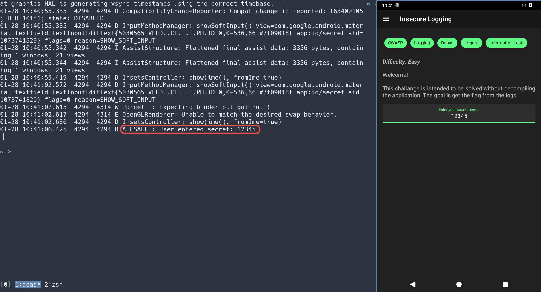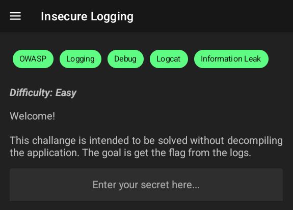 As the name of the challenge reveals, it says there is insecure logging so let’s check the logs of the application and try entering secrets…