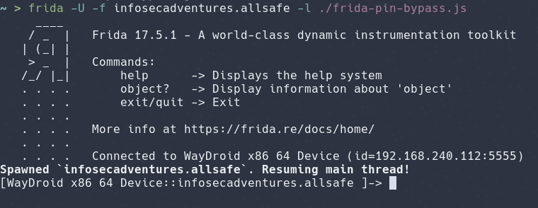 frida -U -f infosecadventures.allsafe -l ./frida-pin-bypass.js